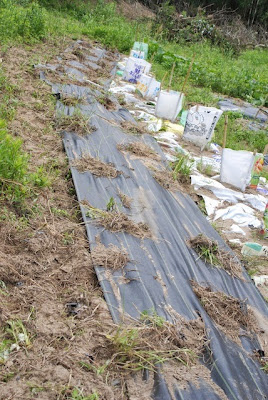 肥料袋のビニールに1枚越しに小さな穴をあけ、そこに1個づつ種をまいた。 育つ時に雑草にやられないようにその脇には防草シートも敷いた。 |