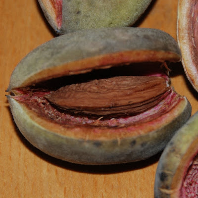 | 種の形は、通常食べるアーモンドと似ているが大きさは3倍くらいある。 この種の外側は硬い殻だ。 |