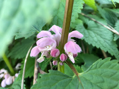 | ホトケノザに似た花だが、大きな雑草の茎の途中に花をつけている。 |