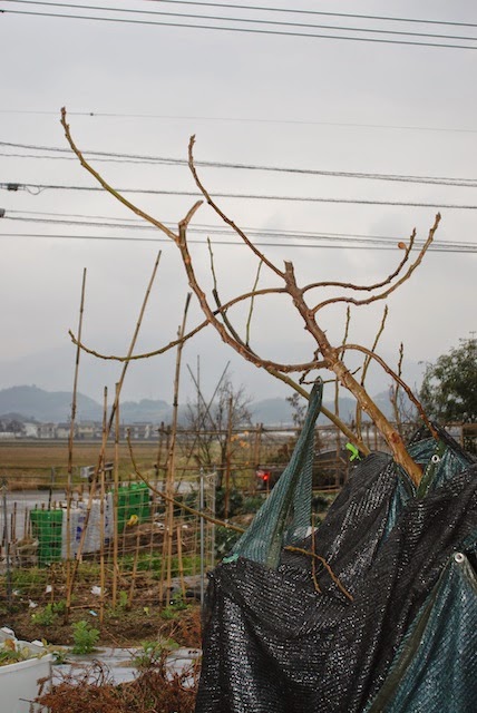 車庫の方に枝が伸びては困るし、反対側の畝の方に枝が伸びても困るのだ。