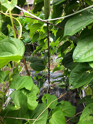 | この実なら支えるところなく下に向かって成長して記録を作るかもしれない。 この実を付けた苗は、側の畝から宇宙芋の畝の方に侵入して実を付けた。 |