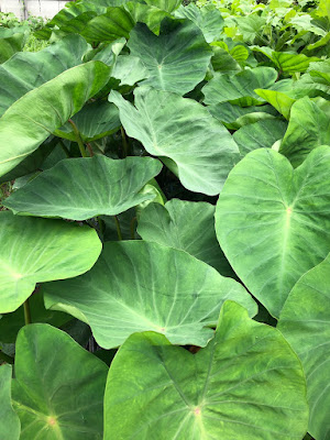 | 高さは1m弱だが、里芋の葉は大きく茂り元気いっぱいだ。 |