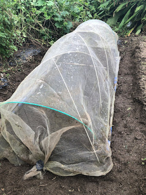 ルッコラやエンダイブの場合は防虫ネットは通常要らないと思われるが、雨の跳ね返りが少なくて、小さな苗でも食べやすいようにと思ってネットを掛けた。