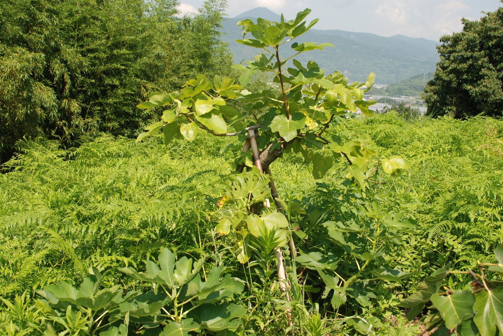 この植えたイチジクの苗木が生き残るかどうかは、周りの雑草との力関係だと思っていた。案の定、細い茎の苗が雑草に負けた。