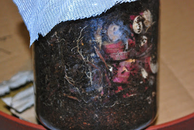 | 左のつくね芋はついに跡形なくなった。1位確定だ。右のサツマイモはまだまだほとんど食べられていない。経験上は少し柔らかくなり始めたようなサツマイモはみみず君の大好物なのだが。 |