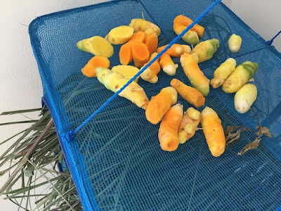 皮を剥いたウコンは干すのだが、いつも干すのに使う網カゴは今はレモングラスに占拠されている。