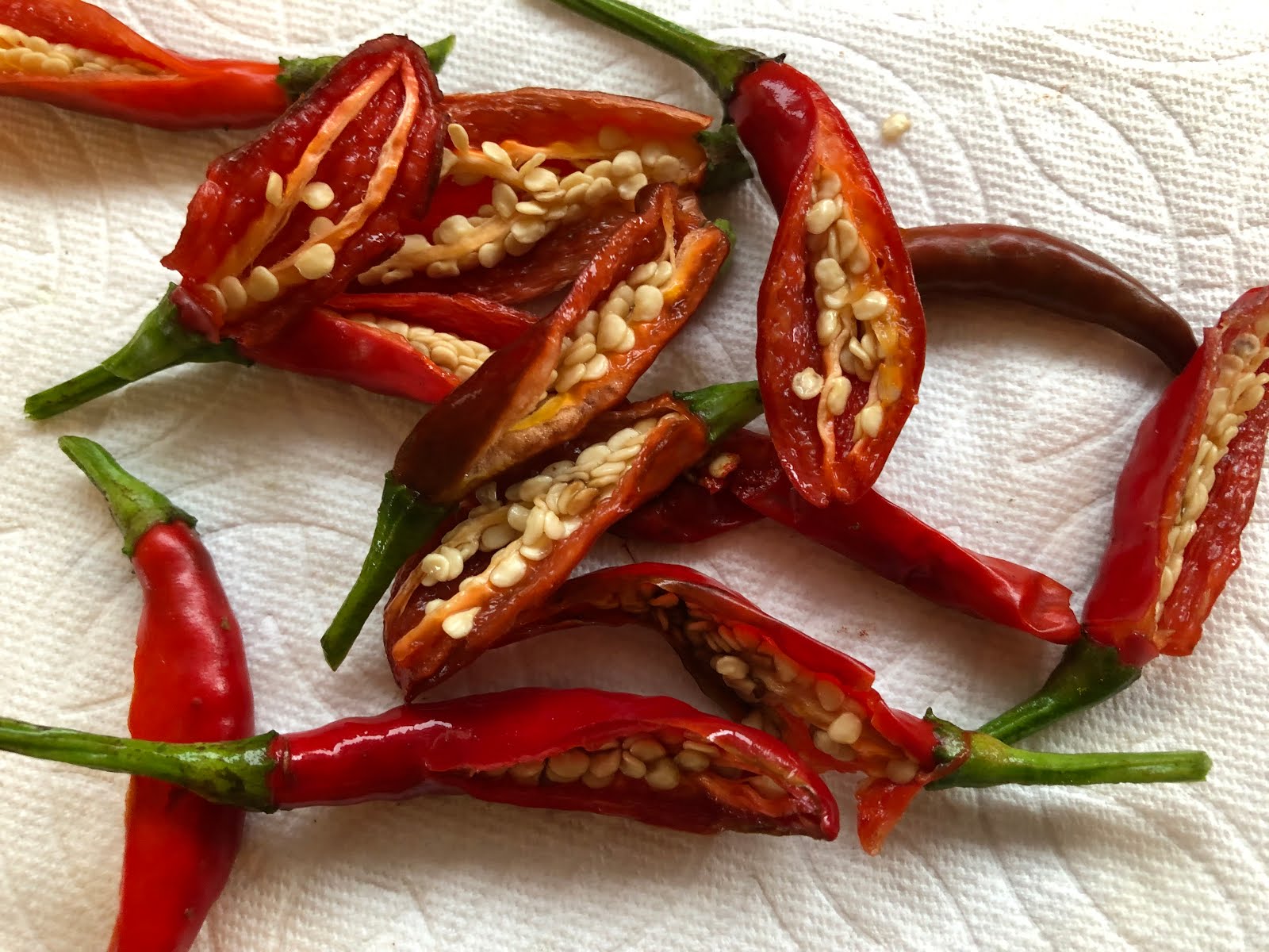 ところで、はじけていたトウガラシからはいい種が採れそうなので、一部種取り用にこんなトウガラシも持って帰った。