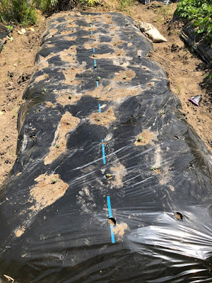 そして、オクラの余った紙ポット苗は不必要だったかもしれないが、十数個のみマルチを張った小さな畝に同じように定植した。