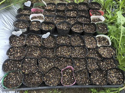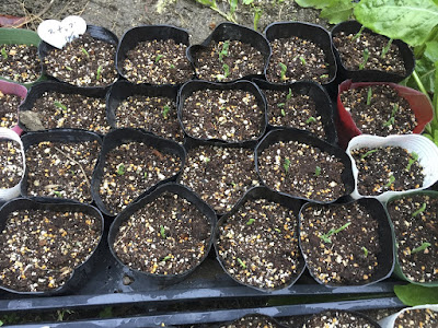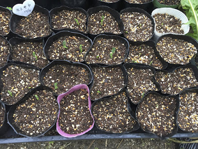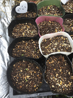 | 20ポット中、芽が出ているのは8ポット。 100%ではないかもしれないが、自家採種種から発芽することは証明された。 最終的に12ポットくらい芽が出てくれればと思っている。 |
