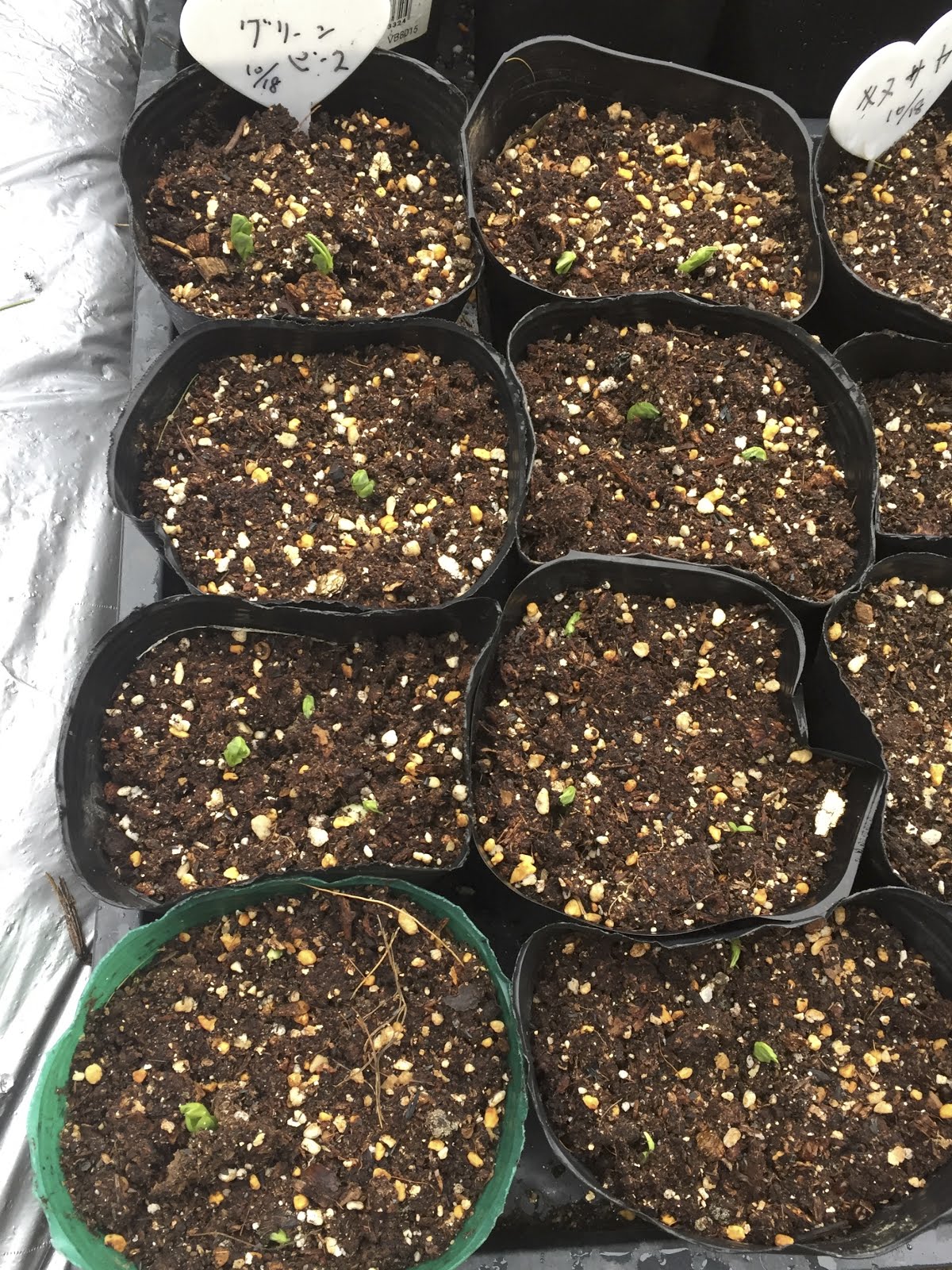 | 20ポット中、芽が出ているのは8ポット。 100%ではないかもしれないが、自家採種種から発芽することは証明された。 最終的に12ポットくらい芽が出てくれればと思っている。 |