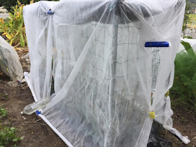ちょっと工夫したところは、不織布の下の方を固定している鉄パイプを、上に持ち上げるだけで、簡単に、内部の管理が出来るようにした。