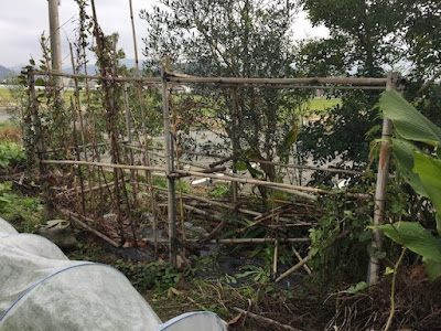 これは5年前、かぼちゃの空中栽培用に作った、3段の竹の棚。