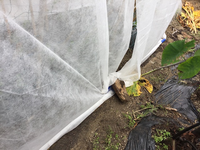 ちょっと工夫したところは、不織布の下の方を固定している鉄パイプを、上に持ち上げるだけで、簡単に、内部の管理が出来るようにした。