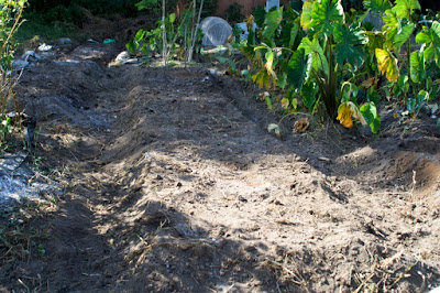 | スペースは狭かったのだが、その割に収量は多かった。 この畝には、今は宇宙芋がしっかり育っている。 |