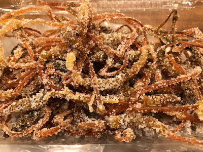 | これはツクシに砂糖をまぶしたもの。 砂糖をまぶす前に軽く揚げているのだろうか? 86歳になるおばあちゃんだが、頭は柔軟でその独創性には感心させられる。 |
