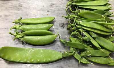 | こちらが今日収穫したエンドウ豆。 今年はオババから赤い花が咲く絹さやの種を頂いていた。 その苗からできる実は左下のように巨大なのだが食感はどうなのだろうか? |