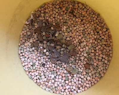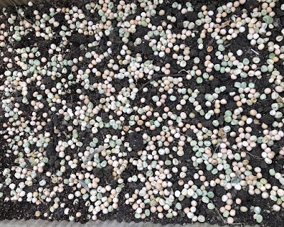 | 去年より一段大きなプランターに浅く入れた土の上に豆を置いていった。 豆はかなり余ったので、必要時にはもう1回同じ事が出来る。 |