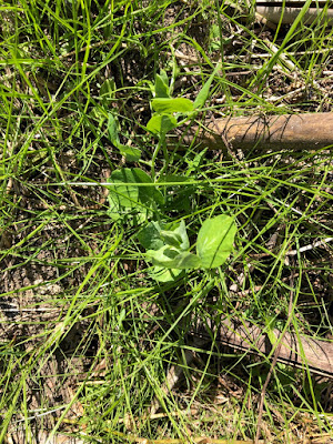 雑草の陰で芽は見えないが近づいてみると、ちゃんと芽出しできている。