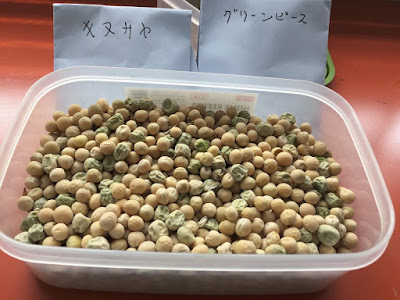 | 茶色で丸いのは絹さや。 緑色でシワが入っているのがグリーンピースだ。 |