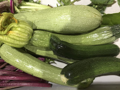 | こちらは昨日の収穫。今収穫できているのは黄緑と緑だ。 中でも花も食べれる黄緑ズッキーニが収穫の中心だ。 私が大好きな白ズッキーニの収穫は、小さな実をつけ始めたのでもうすぐだ。 |
