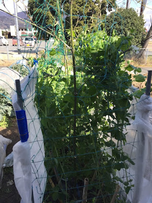 | このエンドウの苗たちは元気で、現在いっぱいの花を付けている。 サイドの風除けの不織布は、完全に破れるまでこのまま置いておくことにしている。 |