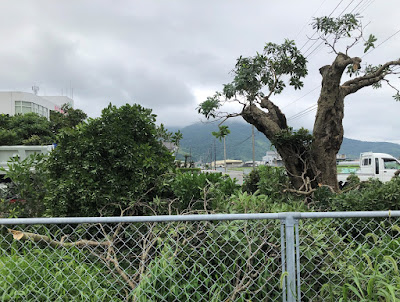 | こちらは菜園側にあった大きなヤマモモの木。 太い幹と小さな枝だけを残してほとんど伐採されてしまった。 枝はまた成長するだろうが、来年のヤマモモ収穫は難しそう。 |