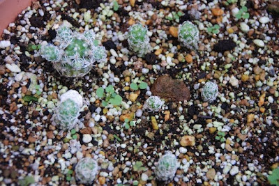 | 5cmくらいの小さなサボテンが今では30cm以上のノッポさん。 先日大きな鉢に植え替えをした。 サボテンの土以外に、ミミズ堆肥も入れたら、冬瓜の芽が出てきた。 |