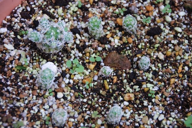 | 5cmくらいの小さなサボテンが今では30cm以上のノッポさん。 先日大きな鉢に植え替えをした。 サボテンの土以外に、ミミズ堆肥も入れたら、冬瓜の芽が出てきた。 |