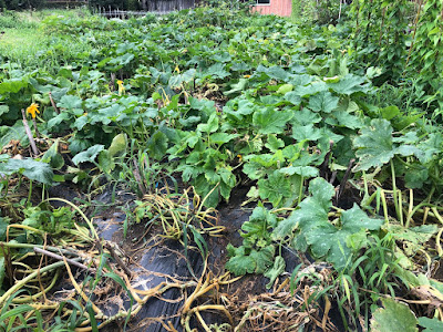 長いズッキーニの苗も、ここのところの長雨でかなり弱ってきたのだが、通常のズッキーニの苗と比べるとまだしっかりしている。