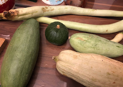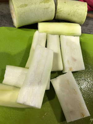 収穫した長いズッキーニは下の写真のように冬瓜料理と同じような、うす醤油味付けの煮込み料理で美味しく頂いているが、とても食べきれない。