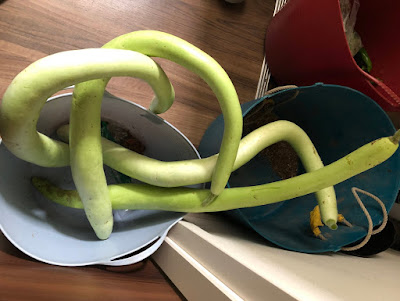 | 後ろにあるのが、昨年収穫した137cmの記録ズッキーニ。 今回収穫した手前の実は手尺通り120cmジャストだった。 私の手尺計測は思いのほか正確なのだ。 |