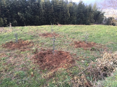 | すべて、高さ1m強程の苗だ。 苗屋さんの話だと、早いもので3年後には実を付けるとのことだ。 |