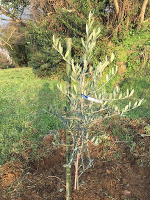 | 第一菜園に3年近く前に植えたオリーブの木。 問題は、ここに植えたオリーブの種類を忘れてしまったことだ。 葉をちぎって、ネットで調べてみたが、私には全く種類が分からない。 |