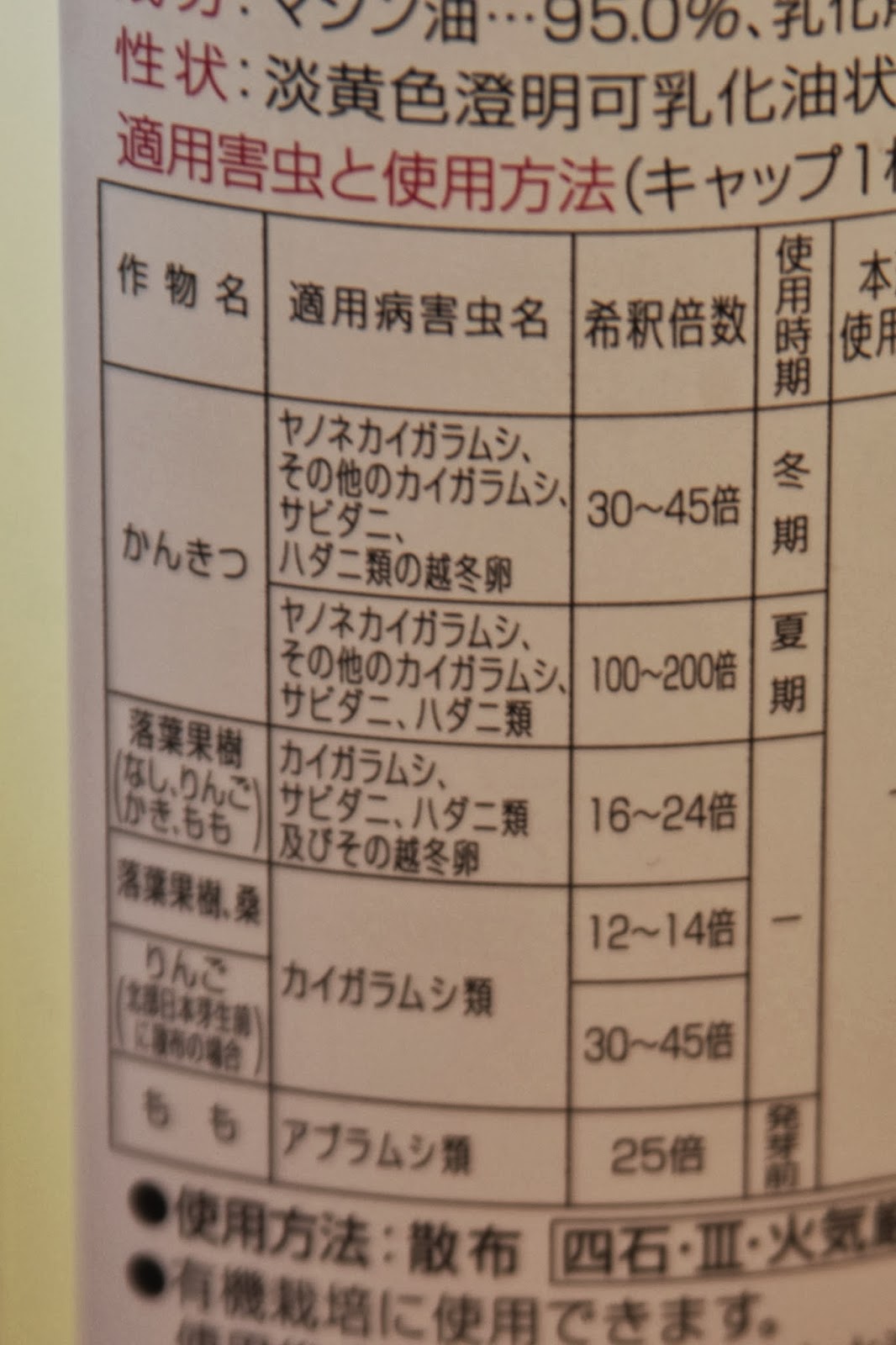 | ミカンの木のカイガラムシに使うことにしたマシン油乳剤。 |