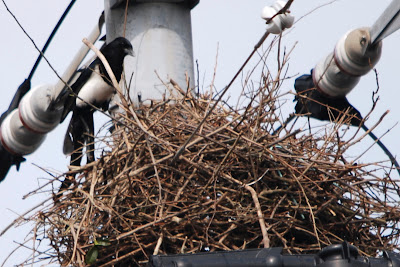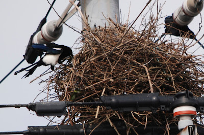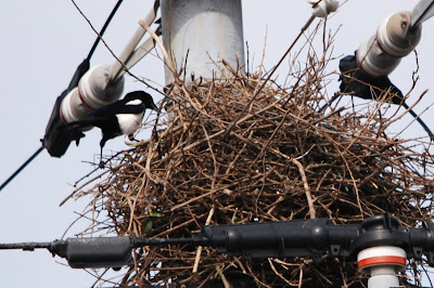 巣の中には小枝に混じってハンガーだろうか?青い針金のようなものも見える。