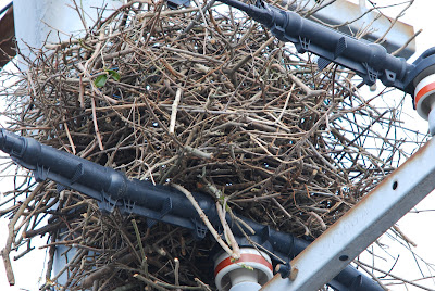 巣の中には小枝に混じってハンガーだろうか?青い針金のようなものも見える。