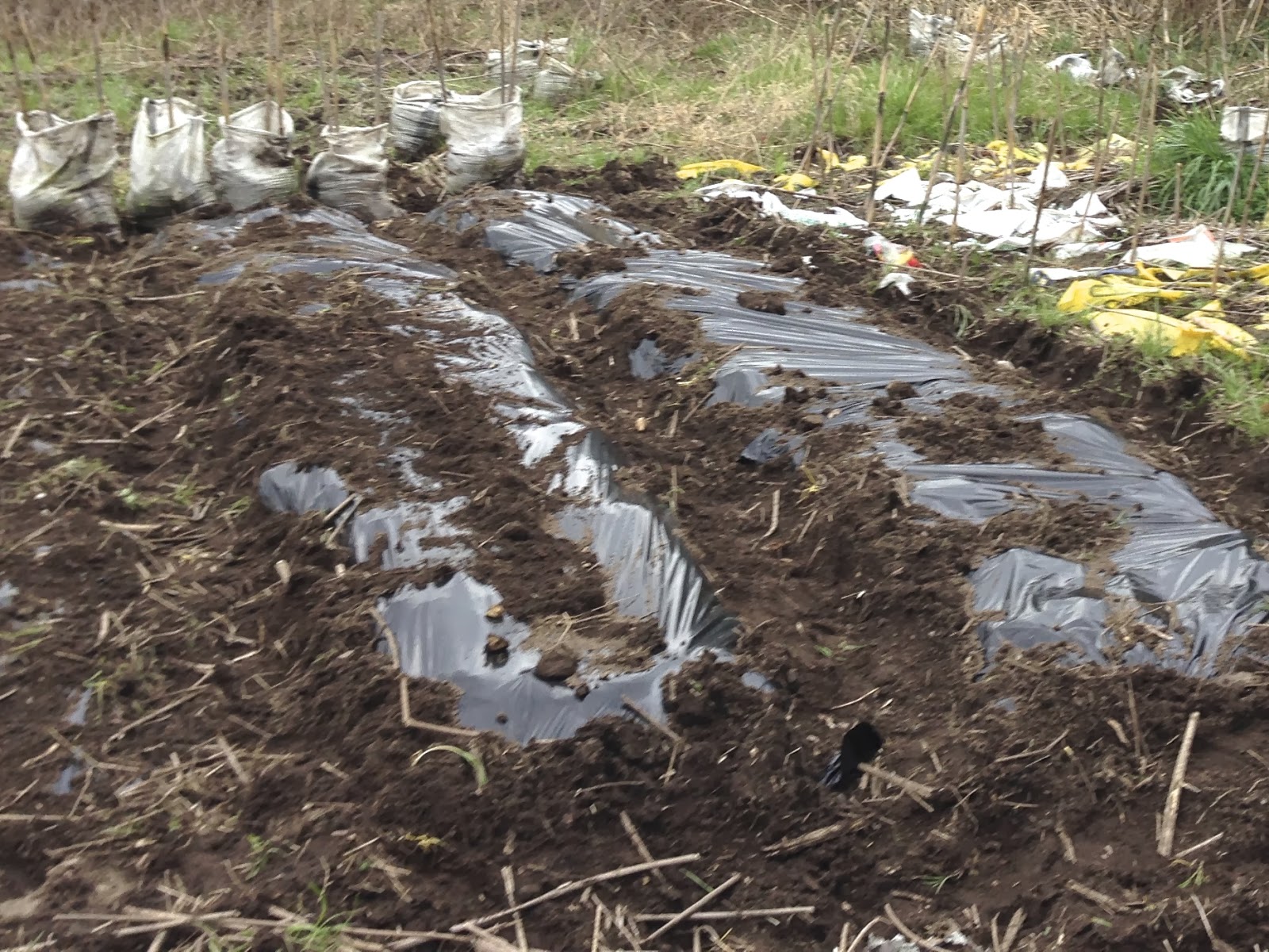 | 通常ジャガイモを植える畝にはマルチは掛けない。 しかし、ここはカチガラスが毎日遊びに来る場所。 マルチを掛けないと、種芋を掘り返されることは確実だ。 ある程度芽が出てきたところでマルチに穴を開ける予定だ。 |