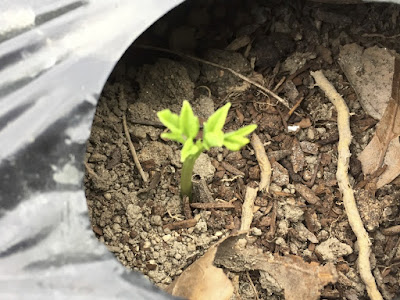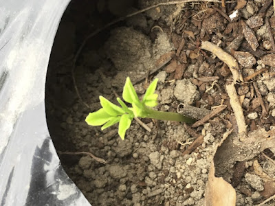 ポット蒔きと直蒔きをしておいたのだが、2週間経って、ついに直蒔きの芽が2本出てきた。