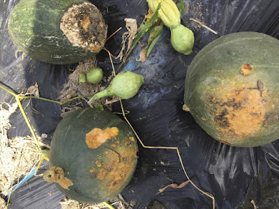 | 痛み始めのカボチャは、まだ食べれる。 こんなカボチャはとても甘いのだ。 側に見えるミニカボチャは生で食べれる。 |