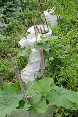 こんな感じで雑草の中にカボチャの苗を植えた土嚢袋を置いている。