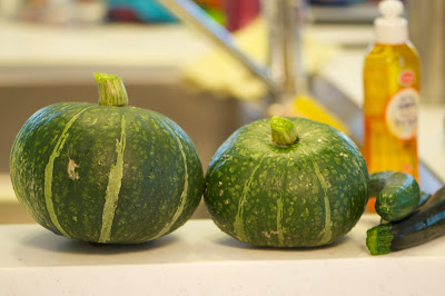 ということで、今年のカボチャの初収穫は屋上土嚢袋に植えて、空中に浮かせた遮光ネットの上で育ったカボチャになった。