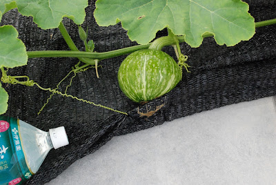 | カボチャが出来ているところは、その重さでネットが沈みがちだ。 コンクリートの熱予防にカボチャの下のコンクリートに折り畳んだ遮光シートを敷いている。 |