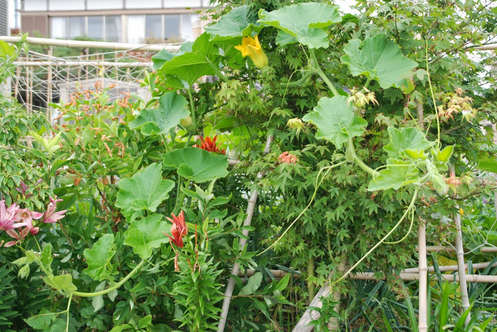 一方、竹の棚による空中栽培は蔓がどんどん伸びて、南側のシンボルツリーの方に侵入している。