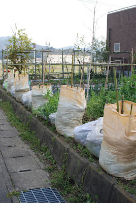 そして、下の写真はゴボウの種が入ったガラ袋と将来サツマイモを育てる予定の土嚢袋が整然と並んでいるところ。