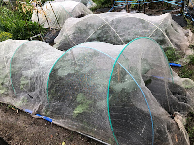| 手前が順調に苗が育っているブロッコリーやチーマディラーパの畝。 その奥の防虫ネットの中では黒キャベツが育っている。 |