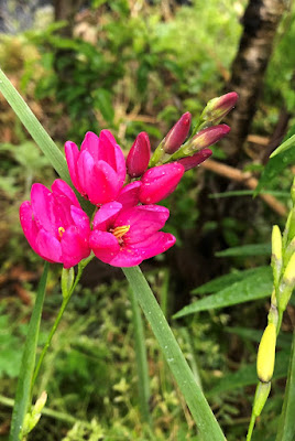 そんな雨の日の菜園側の花壇では赤いイキシアが咲き始めた。