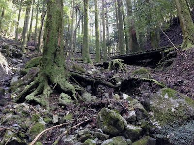 | この雑草地のガラ袋にゴボウを植えた。 十分深く掘り返して笹竹の侵入を防いだつもりだったが、甘かった。 ゴボウの収穫はごく僅か。このすぐ側に長芋を植えたガラ袋が一つあった。 |