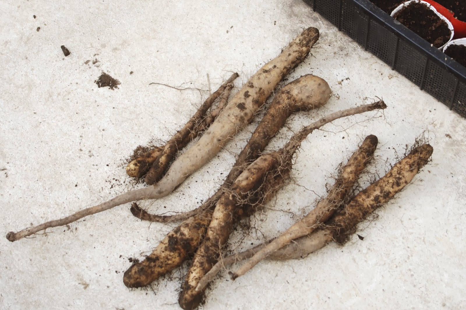| ゴボウは先端の方が細くなるが、長芋は先端部分が太くなっている。 ゴボウ以上に折れ易いものなので、ガラ袋で育てるというアイデアは正解だっただろう。 |