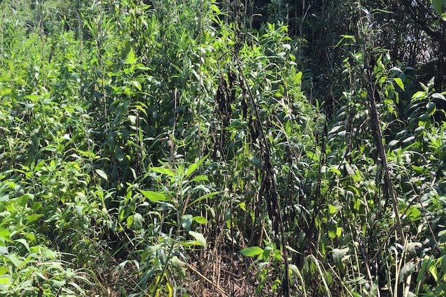 以前の名残りは、左手に見えている倒れてきたキクイモ。 畝の周りには、まだキクイモがたくさん自生している。 |