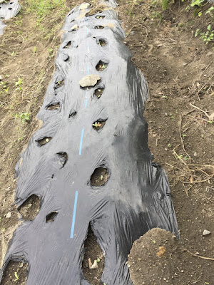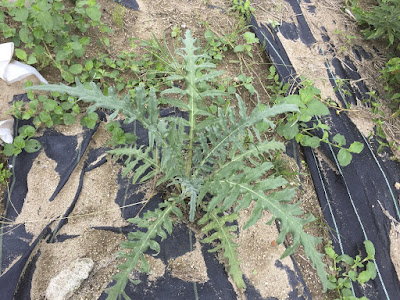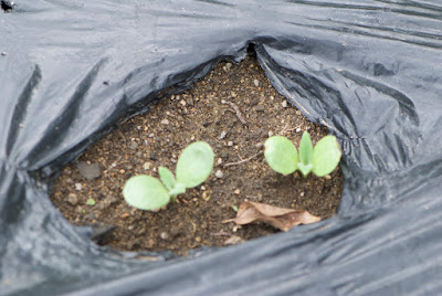 | アーティチョークは雑草よけシートに10cmほどの穴を開けて種を蒔いた。 |